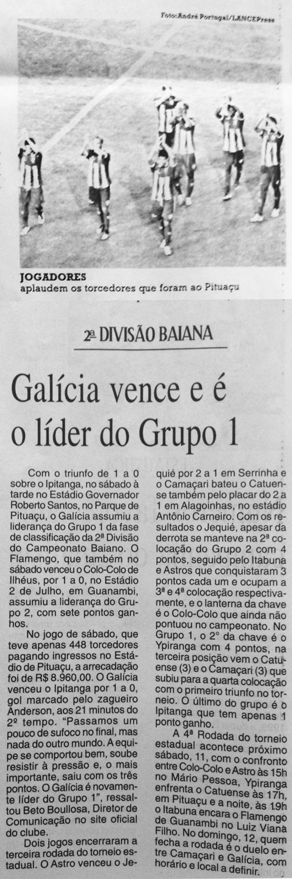 O jornal falou sobre os resultados da terceira rodada do Campeonato Baiano da Segunda Divisão 2013, destacando o jogo do Galícia em Pituaçu e reproduzindo um trecho do Lance-a-lance do site oficial do Demolidor de Campeões.